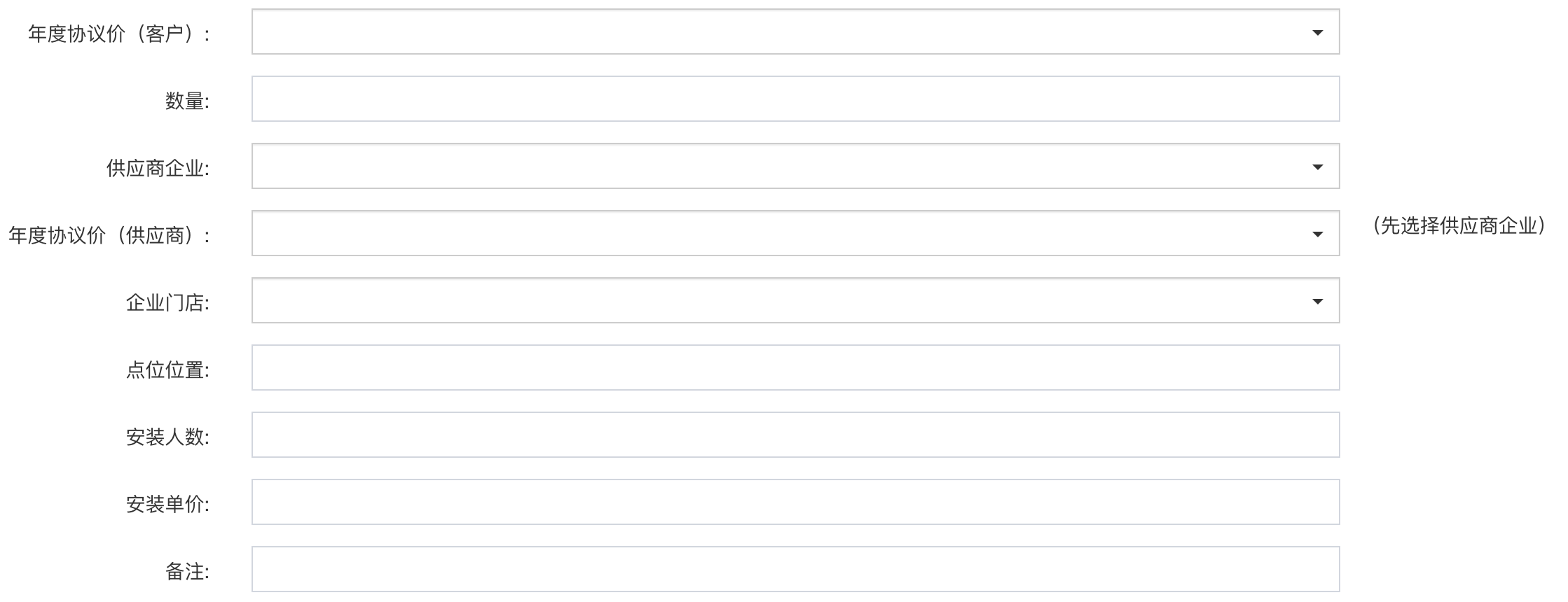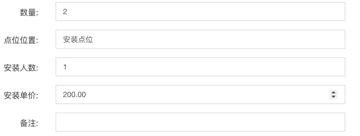 - 安装人数、安装单价:安装总价 = 安装人数 * 安装单价