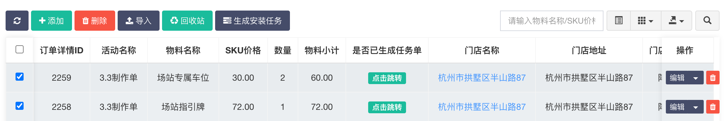 - 生成安装任务单后,列表 是否已生成任务单 会显示 点击跳转,点击可跳转到安装任务详情
