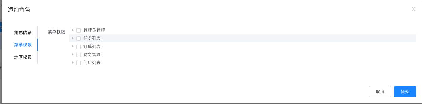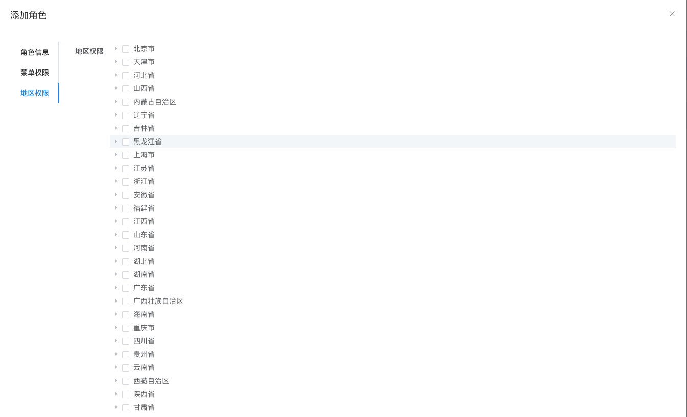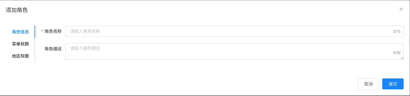 填写角色名称 分配角色权限(指该角色可访问的菜单及可操作的按钮) 分配地区权限(指该角色可访问的地区信息)