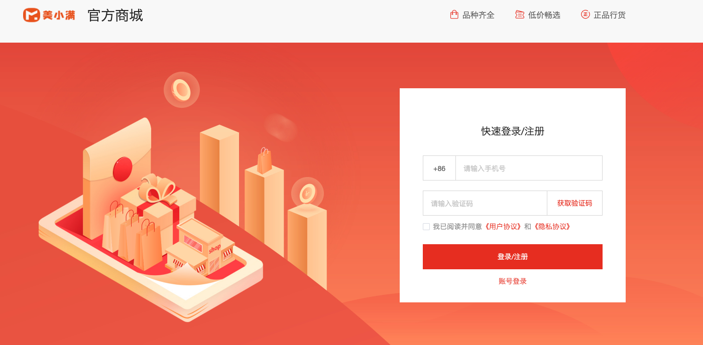 - 打开网站,点此打开美小满商城,点击右上角 登录/注册,使用手机号登录